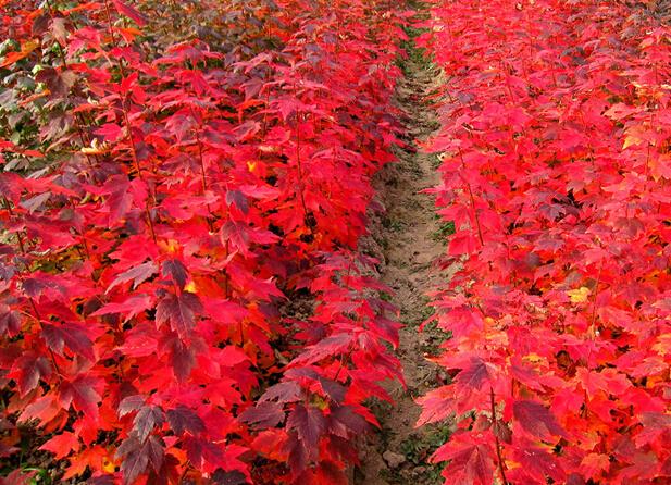 美國(guó)紅點(diǎn)紅楓(學(xué)名:Acer rubrum ‘Redpointe’):原產(chǎn)美國(guó)東海岸,是落葉大喬木。生長(zhǎng)較快,成年高樹(shù)12-18米,冠幅12米,能適應(yīng)多種范圍的土壤類型生長(zhǎng)。春天開(kāi)花,花紅色。因其秋季色彩奪目,樹(shù)冠整潔,被廣泛應(yīng)用于公園、小區(qū)、街道栽植,既可以園林造景又可以做行道樹(shù),深受人們的喜愛(ài),是近幾年引進(jìn)的美化、綠化城市園林的理想珍稀樹(shù)種之一。是可以用做行道樹(shù)的彩葉樹(shù)種。